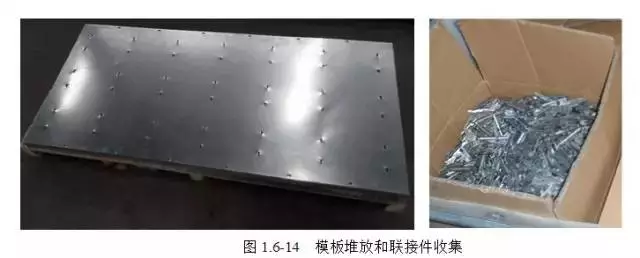 4、拆除模板時應有防止模板隨意墜落的安全措施。如模板四角的聯接件最后拆除,一手托緊模板,拆除四角聯接件后,輕輕取下模板。模板拆除后,應堆放整齊,如圖1.6-14所示。不允許因暴力拆除引起的模板較大變形。